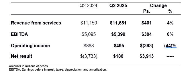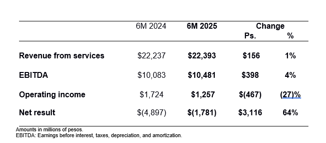 Revenue for the first six months of 2025 was Ps.22,393 million, compared to Ps.22,237 million for the previous year, reflecting a 7% increase in residential revenue and a 26% decrease in enterprise revenue. Total costs and expenses decreased 2% to Ps.11,912 million, from Ps.12,154 million, driven by a 28% reduction in service costs and a 13% increase in general expenses.