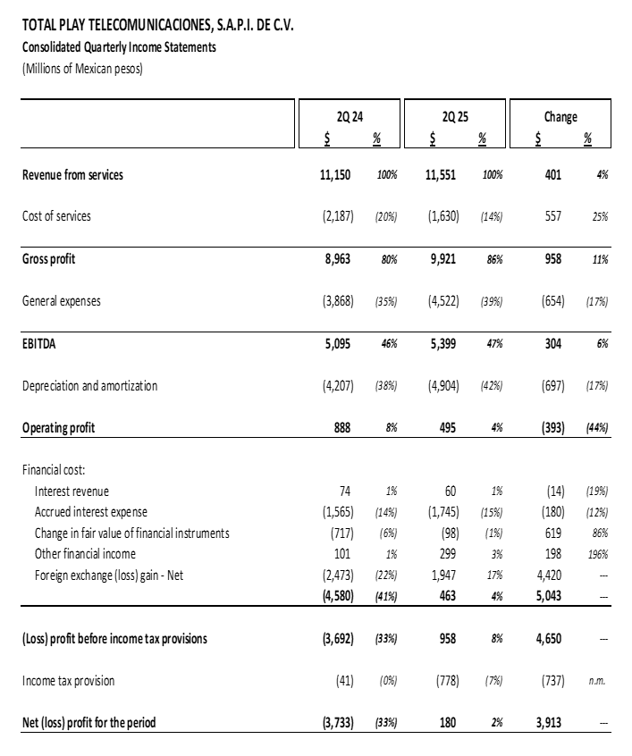Mexico City, July 23, 2025— Total Play Telecomunicaciones, S.A.P.I. de C.V. (“Total Play”), a leading telecommunications company in Mexico, which offers internet access, pay television and telephony services, through one of the largest 100% fiber optic networks in the country, announced today financial results for the second quarter of 2025.