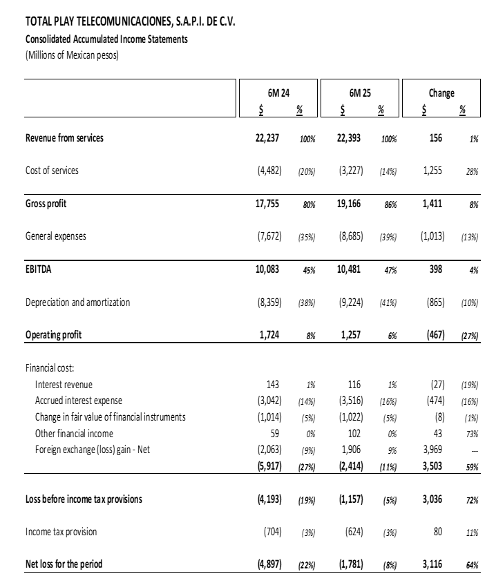 Total Play reported EBITDA of Ps.10,481 million, 4% higher than Ps.10,083 million a year ago; EBITDA margin for the period was 47%, two percentage points higher than the previous year. Operating income was Ps.1,257 million, up from Ps.1,724 million in the same period 2024.