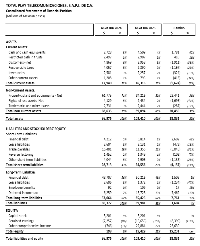 Total Play’s fixed assets — comprising accumulated investments in fiber optics, telecommunications equipment, subscriber acquisition costs, and other assets — were Ps.84,216 million, compared to Ps.61,775 million a year ago. The increase is related to the periodic recognition of the fair value of fixed assets — revaluation — under both the Multi-Period Excess Earnings Method and the Market Approach, done in the prior quarter.
