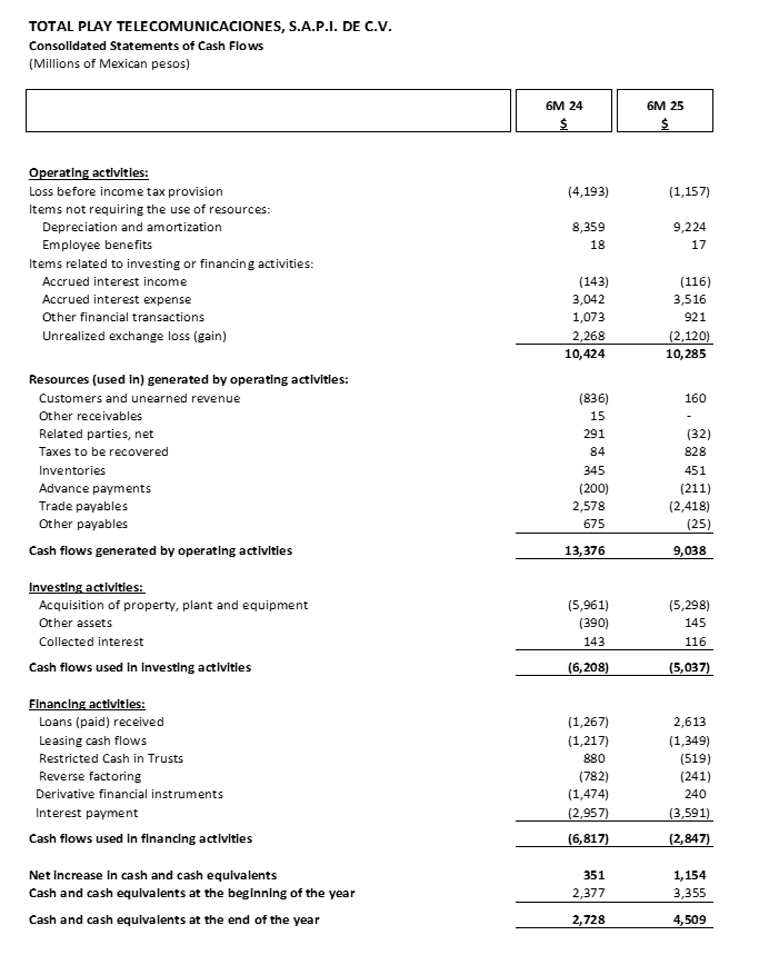 Total Play reported a net income of Ps.180 million, from a net loss of Ps.3,733 million for the same quarter 2024.